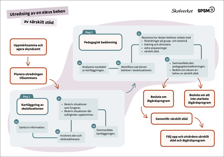 En karta med pilar, bubblor och numrerade steg på hur skolorna ska jobba för att utreda huruvida en elev behöver särskilt stöd eller inte. Labyrinten finns även att ladda ned som poster på Skolverkets webbplats.