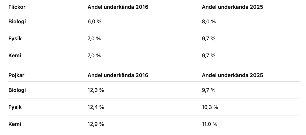 Utvecklingen går åt fel håll för flickorna, men samtidigt har de fortfarande högre genomsnittliga betygspoäng än pojkarna i alla NO-ämnen (trots att utvecklingen går åt rätt håll för pojkarna). Det är också färre flickor än pojkar som underkänns (F eller streck).