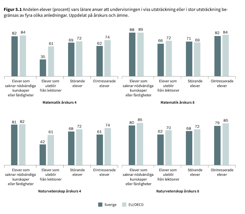 Ointresserade elever påverkar undervisningen i matematik och naturvetenskap, visar den senaste Timss-rapporten. Hela 72 procent av de svenska åttondeklassarna har lärare i matematik som anser att undervisningen begränsas av att eleverna saknar intresse, stör eller uteblir från lektionerna (se diagrammet nedan för en detaljerad beskrivning av vilka faktorer som begränsar mest). För NO-ämnena är motsvarande siffra 65 procent.