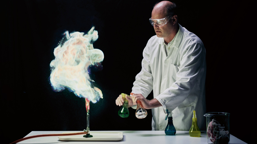 När Christian Killiner sedan sprejar vätskor på elden skiftar lågan mycket riktigt färg, beroende på vilken flaska som används.