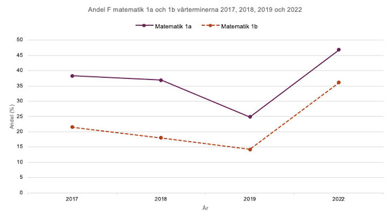 I matematik 1a och 1b blev provresultaten mycket nedslående. Våren 2022 var andelen elever som fick F (underkänt) i de nationella proven i kursen matematik 1a 46,9 procent. Det är nästan en dubblering jämfört med våren 2019 när motsvarande andel i matematik 1a var 24,9 procent.
