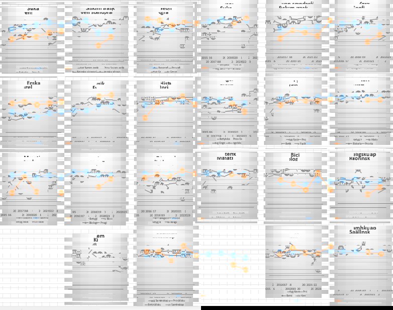 Provbetyg i orange, slutbetyg i blått. 2020 och 2021 ställdes nationella proven in på grund av coronapandemin. 2018 ströks nationella provet i matematik då vissa av delproven läckte på förhand. Källa: Skolverket
