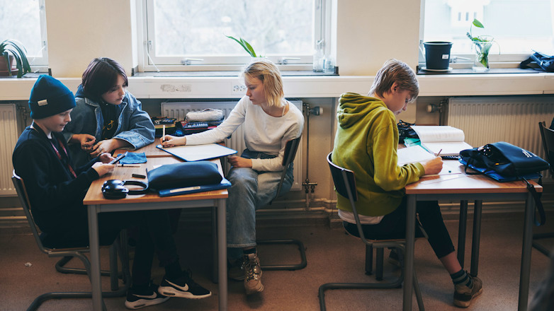 Nu är det grupparbete, men inte för Tage Elweskiöld. I dag fick han möjligheten att jobba själv och sitter nedsjunken i sin matematikbok utan att verka besvärad av att vara omgiven av engagerade diskussioner. Han är van och tillåts räkna i det tempo som passar honom, vilket gäller alla elever i klassen.