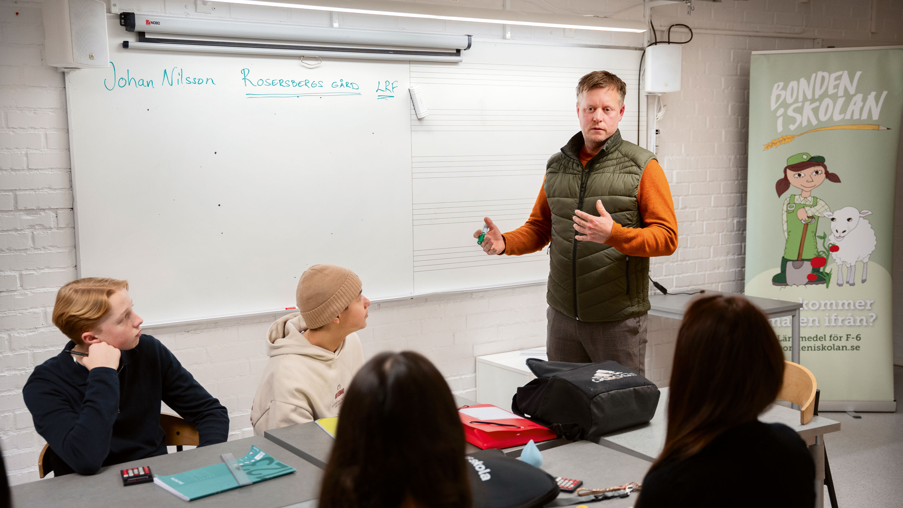 I hörnet av klassrummet har lantbrukaren Johan Nilsson satt upp en stor plansch med en bild på en bonde, ett gulligt lamm och texten ”Var kommer maten ifrån?”.