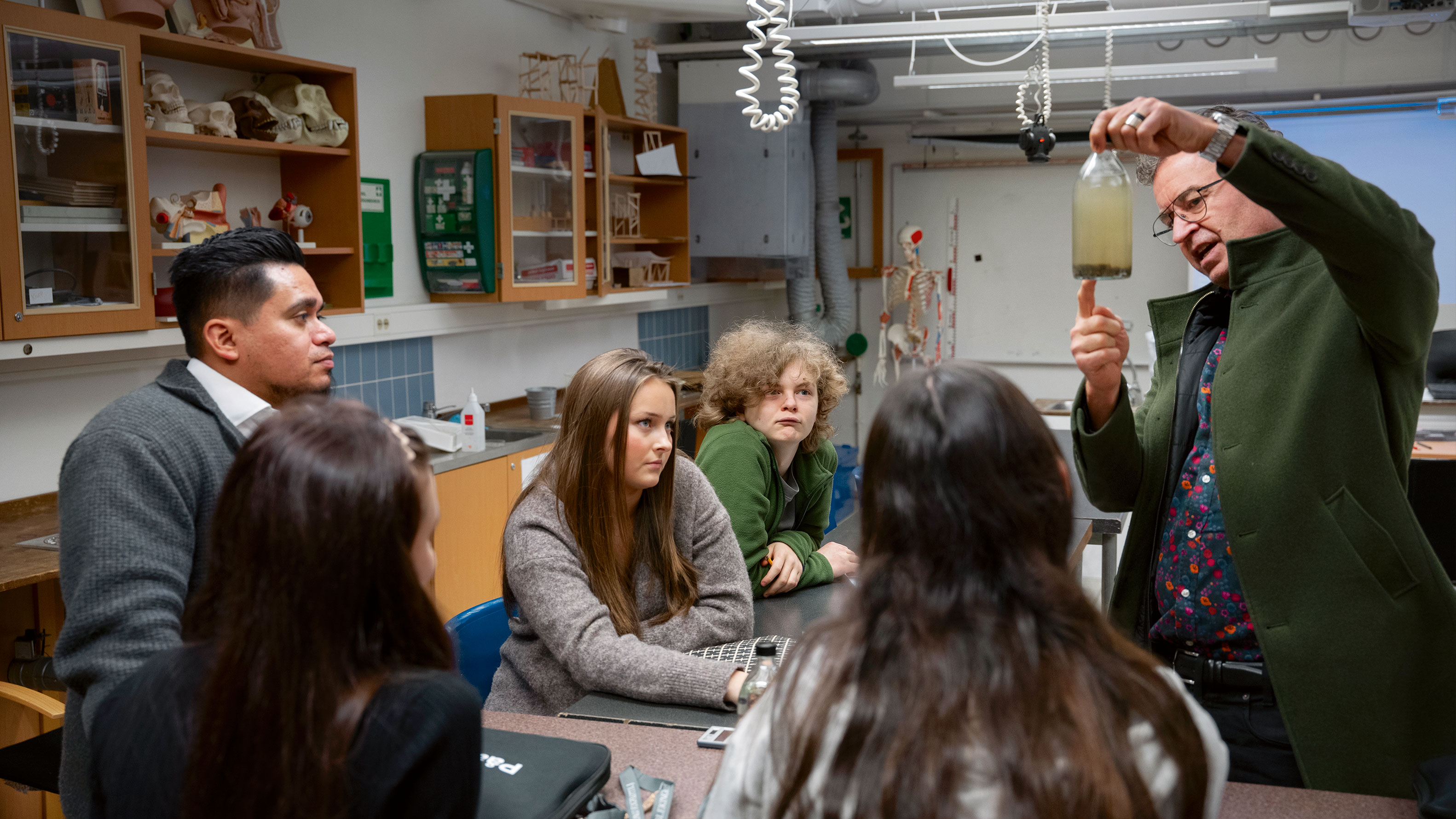 – Det blir nog fordon. Jag gillar att meka på fritiden. Eller så blir det estetiskt, säger han medan kompisarna rynkar lite på näsan åt flaskan med avloppsvatten.