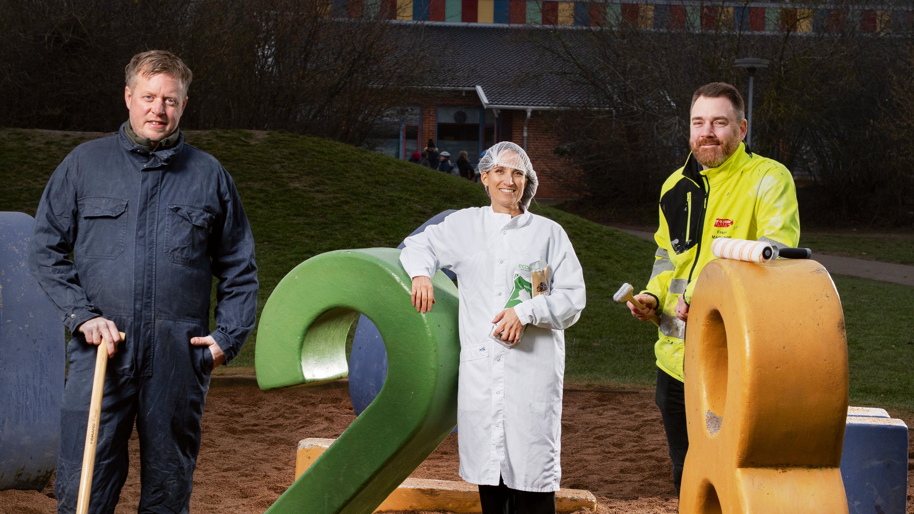 Lantbrukaren Johan Nilsson, Katrin Bergmark, HR-ansvarig, och Joachim Eriksson från en målerifirma är på plats i Påarps skola för att visa att matte är nödvändigt för att klara jobbet.