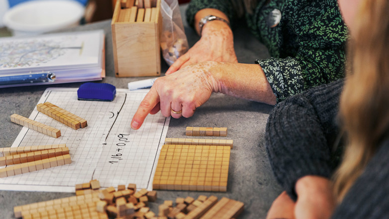 När de har laborerat en stund blir det dags för Vilda att ta fram ett tal med hjälp av klossarna, lägga ihop det med ett annat tal och slutligen dela upp det i heltal, tiondelar och hundradelar.