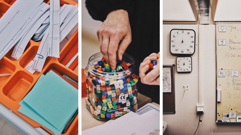 – Det här gör matten enklare att förstå, säger hon och plockar upp remsor och färgade pappersbitar ur lådan.