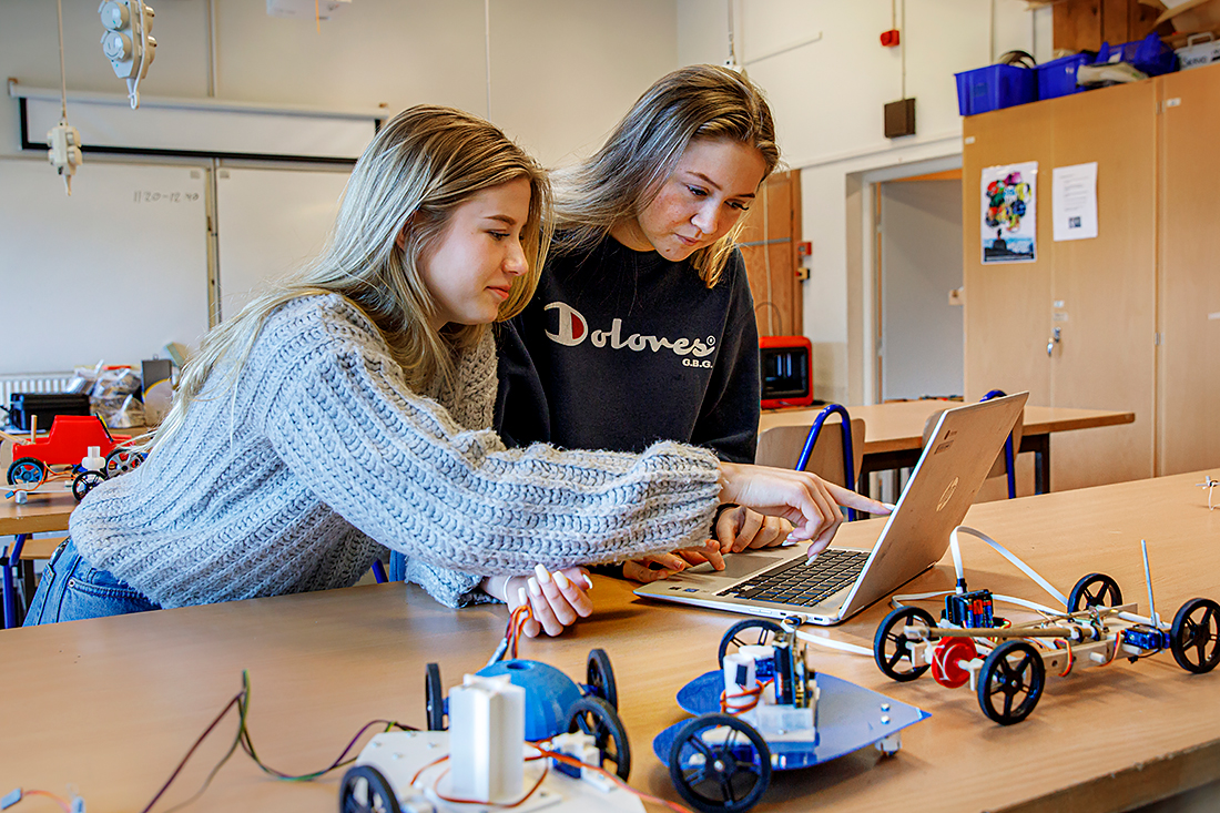 Lina Back och Moa Falk har lärt sig blockprogrammering för att kunna styra sina musfällebilar. Foto: Emelie Asplund