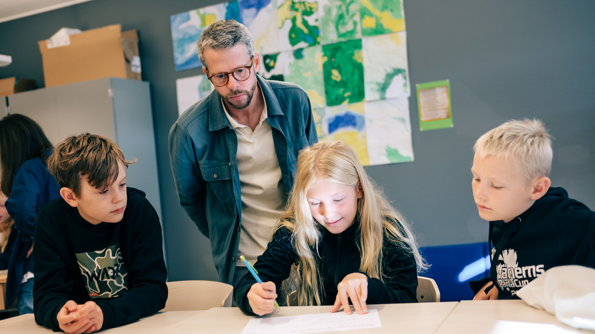 I läraren Petteri Rannikkos klassrum på Varnhemsskolan pågår livliga diskussioner mellan eleverna i årskurs 5.