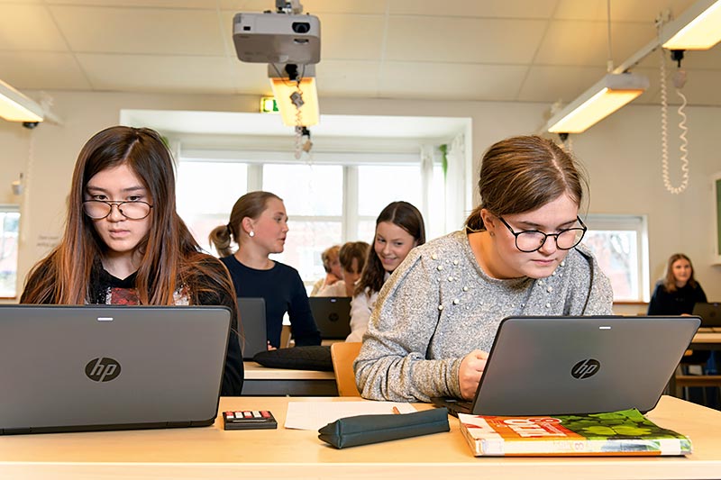 Eleverna tittar koncentrerat på sina datorskärmar och kämpar med uppgifterna men stämningen är avspänd. Klassen är van att ha läxförhör. Det sker varje vecka i matematik och i NO. Helena ser många fördelar med flera mindre förhör än ett stort prov.