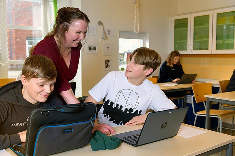 Filip Levrén och Svante Ryman är klara med dagens test i matematik. Deras lärare Helena Kvarnsell kollar läget och ger eleverna nya uppgifter. Foto: Maria Östlin