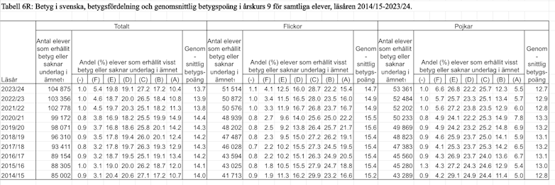 Niornas genomsnittliga betygspoäng i svenska det senaste decenniet har formen av en kulle: från 13,7 poäng 2013 via 14,4 i mitten av perioden till på nytt 13,7 i våras. Andelen underkända i svenska har fördubblats under perioden, från 2,7 procent av eleverna 2013 till 5,4 procent 2024.
