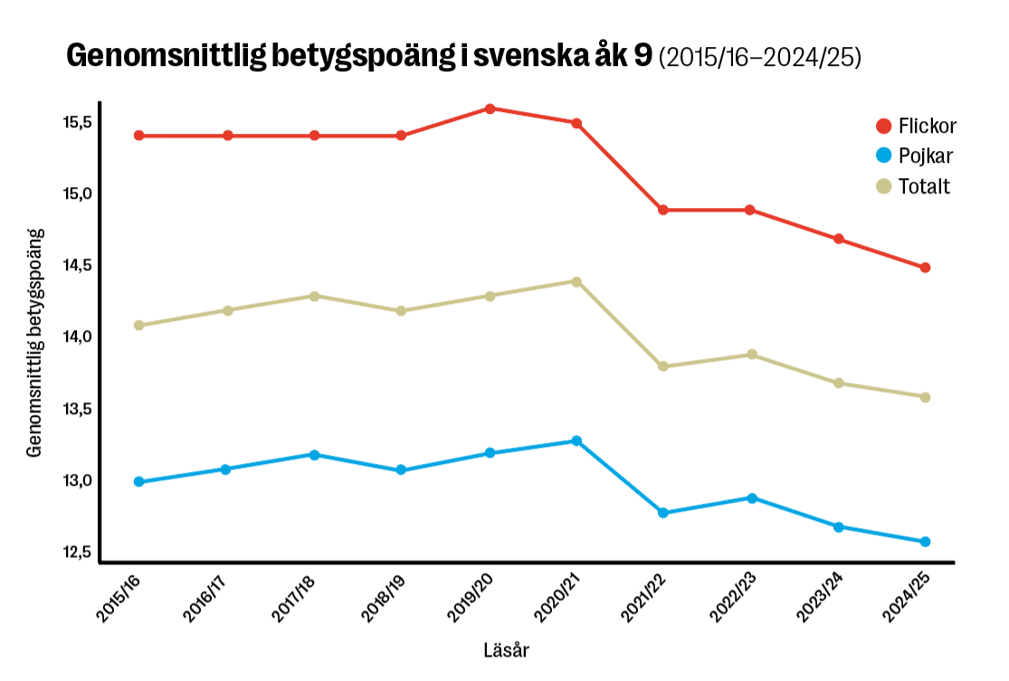 Skolverkets statistik visar att det är flickorna som har tappat mest i svenskämnet över tid. Flickornas betygsgenomsnitt har minskat från 15,4 till 14,5 poäng på tio år. Pojkarnas poäng har under samma period sjunkit från 13,0 till 12,6 poäng.