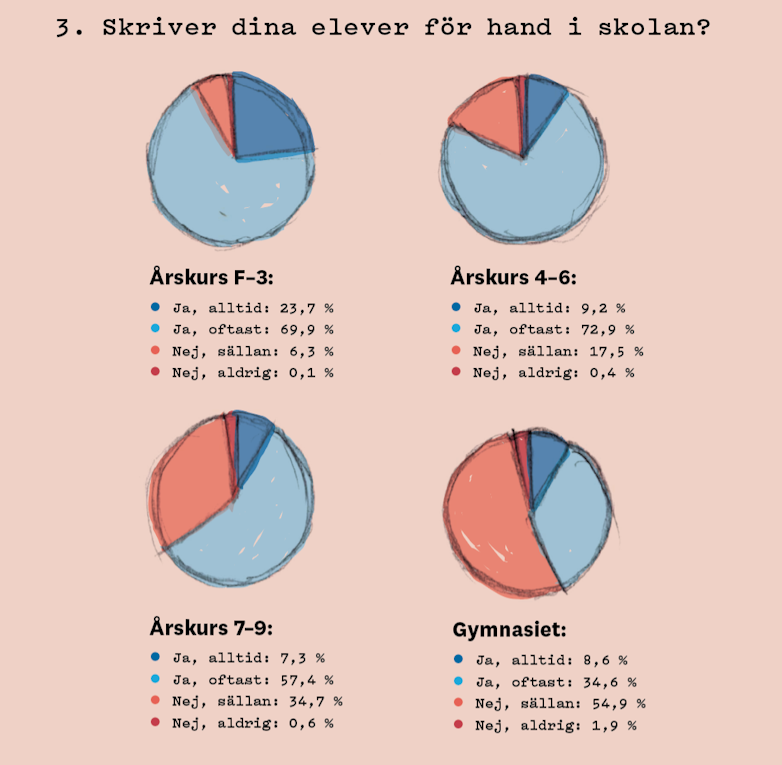 Skriva för hand Elever skriver allt mindre för hand i takt med att datorer, surfplattor och mobiltelefoner kommit in i undervisningen. Är det ett problem? Ja, svarar många lärare. ”Det är mer som distraherar när du sitter framför en skärm”, är en av hundratals kommentarer i vår stora enkät.