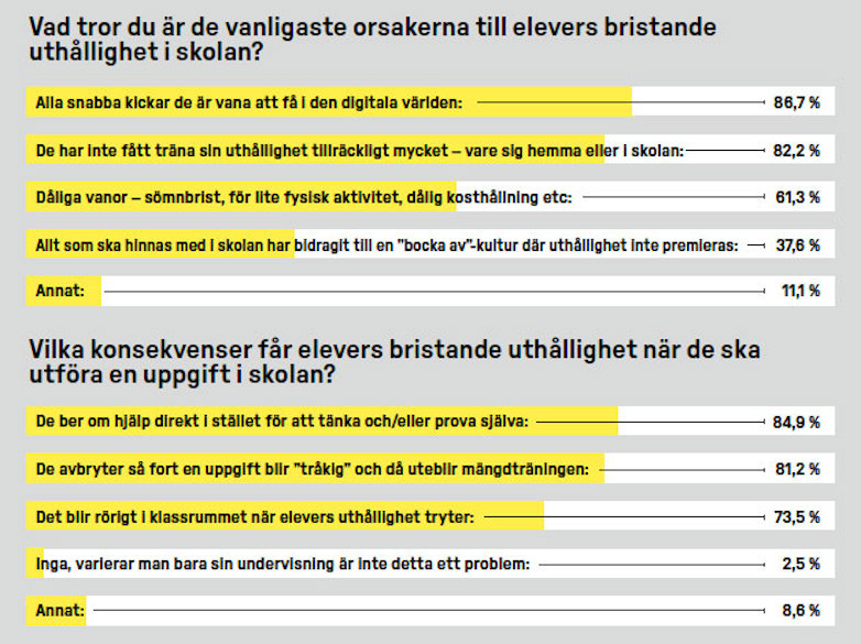 I Ämneslärarens enkätundersökning, med svar från 5 000 lärare, framgår det att 93 procent anser att elevernas uthållighet har försämrats på ett oroväckande sätt. 87 procent av lärarna menar att den starkast bidragande orsaken till det är alla snabba kickar eleverna är vana att få i den digitala världen.