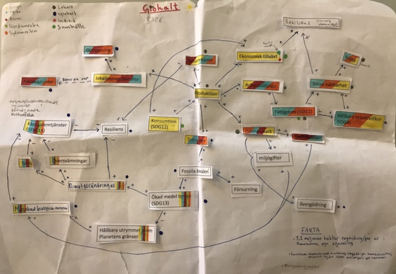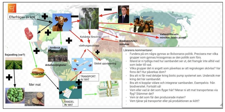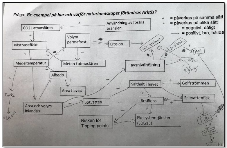 – Många elever är snabba med att dra slutsatser i början, men både när man bygger sambandsväven tillsammans på tavlan eller när de jobbar själva digitalt så ser man att de utvecklar ett geografiskt systemtänkande. De kan förklara både direkta och indirekta konsekvenser och de kan koppla det som sker till olika platser och skalnivåer.