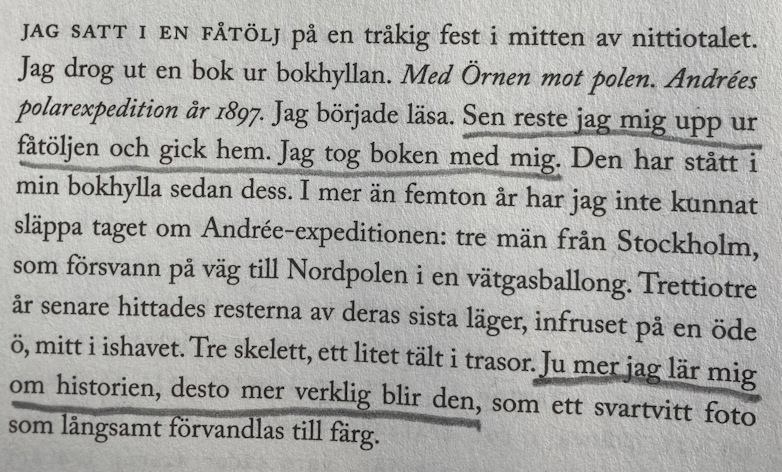 Ur mina anteckningar: Hur man kan bli så intresserad och betagen av något? Fascinerande – har jag varit med om något liknande? Varför blir hon så intresserad egentligen – vad är det i deckargåtan som fängslar – vägen dit med att lägga pussel, organisera och systematisera eller att hitta svaret? Hur kan kunskap göra något ”verkligt” – vad menar hon? En fin bild av växande kunskap och insikt: ”som ett svartvitt foto som långsamt förvandlas till färg.”