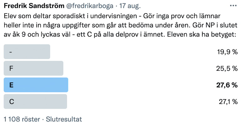 I inledningen av läsåret funderar många lärare på vad undervisningen ska bestå av, hur den ska läggas upp och hur elevernas kunskaper senare ska bedömas. Att läroplanens kunskapskrav bytt namn till betygskriterier kanske också påverkar lärarens undervisning och bedömningsarbete. Jag ställde därför en fråga med tillhörande omröstning på Twitter: