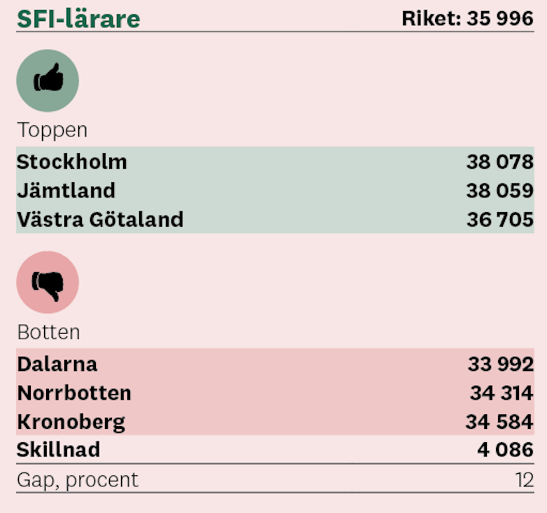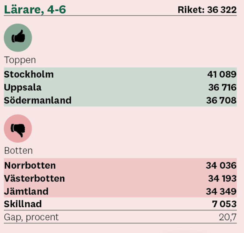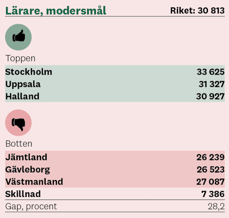Ämneslärare i Stockholm tjänar i snitt 41 301 kronor i månaden på högstadiet och 41 985 kronor på gymnasiet medan kollegorna i Gävleborg bara har 35 246 kronor i månaden på högstadiet och 36 450 på gymnasiet.