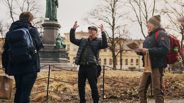 – Er uppgift är att läsa landskapet, säger Anders Fridfeldt högt för att överrösta trafiken. Varför en park här? Varför är det inte bebyggt? Vilka har haft makten över platsen? Vad fanns här före människornas ingrepp?
