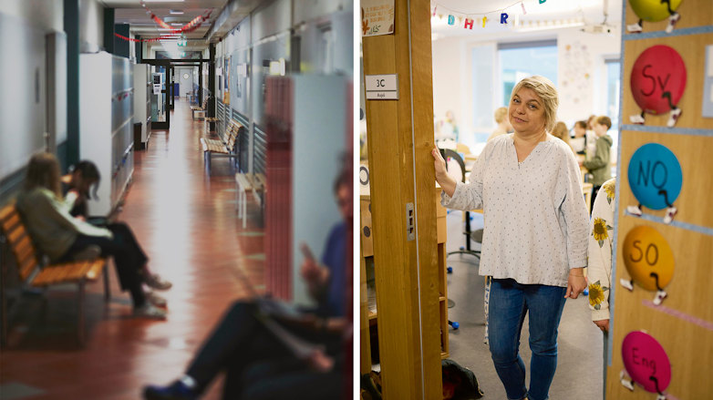 Högstadiets korridorer är trånga, men i F–6-byggnaden där lågstadieläraren Beata Nordgren håller till är lokalerna modernare och rymligare. Foto: Oskar Omne