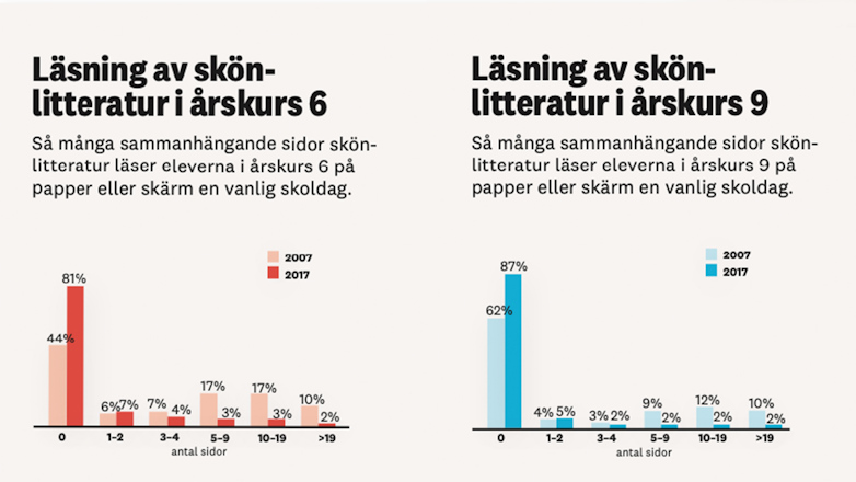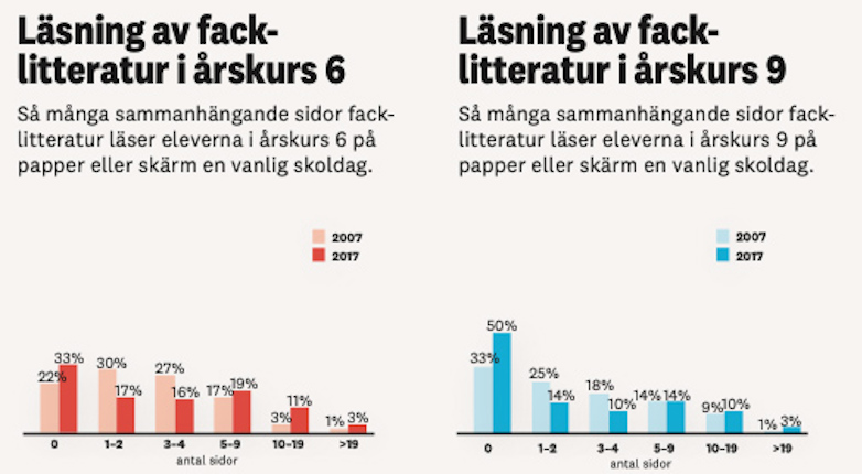 Läsningen i svensk skola minskar drastiskt. 50 procent av eleverna i årskurs nio läser inte ens en sida sammanhängande facklitteratur på papper eller skärm en vanlig skoldag, 2007 var motsvarande siffra 33 procent. Och 87 procent av niorna läser mindre än en sida skönlitteratur en vanlig skoldag, jämfört med 62 procent 2007. Bland sexorna är andelen uppe i hela 81 procent, jämfört med 44 procent 2007.