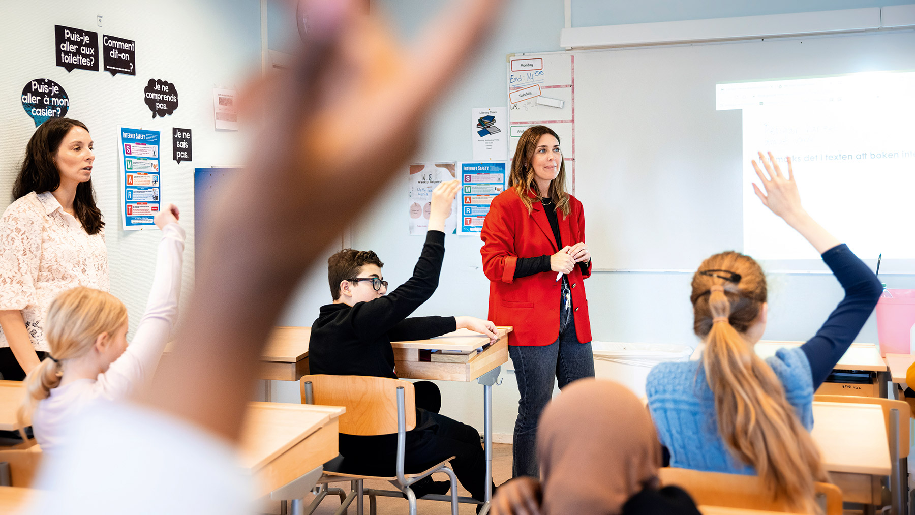På IES i Krokslätt är det två lärare i varje klass i svenskundervisningen, en i svenska och en i svenska som andraspråk, sva. Hanna Engström och Anna Ahlcrona har behörighet i båda ämnena och undervisar i år samtliga sexor i svenska och sva.