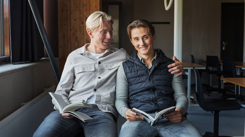 Jonas Tjäder och Kevin Blomberg går i trean på VVS- och fastighetsprogrammet med inriktning kyl- och värmepumpsteknik. De har båda valt att läsa kursen Svenska 3 som individuellt val. Foto: Linnéa Tammerås