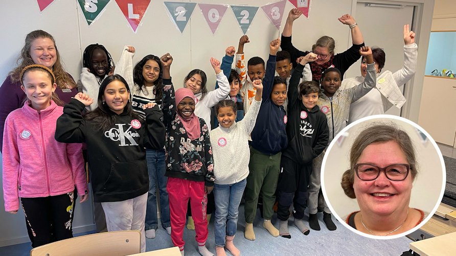 Klassläraren Renate Murken tillsammans med klass 4B på Rosendalsskolan i Linköping. Längst till vänster på översta raden står kollegan Lisa Andersson och längst till höger skolbibliotekarien Birgül Özbaris.