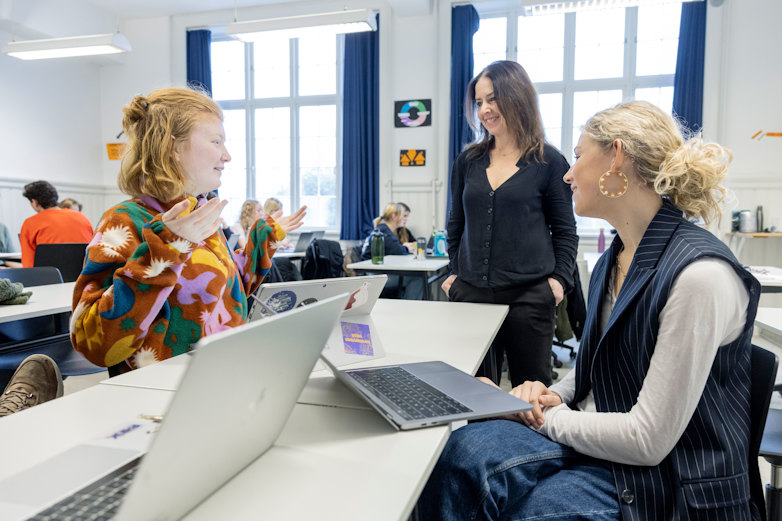 ”Att år efter år gå igenom exakt samma författare kan bli enformigt också för oss lärare. Det kan göra undervisningen mindre engagerad och svårare att individanpassa. Det påverkar eleverna i deras läslust”, säger Mischa Sloth Carlsen. Här med eleverna Rebekka Sø Svendsen, till vänster, och Mie Hylling Axelsson, till höger. Foto: André de Loisted