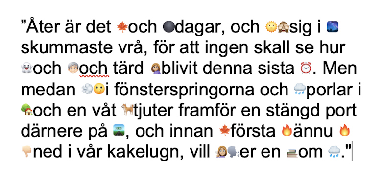 Sedan får elever tolka de här raderna på emojiska: ”Åter är det höst och mörka dagar, och solen gömmer sig i rymdens skummaste vrå, för att ingen skall se hur blek och åldrad och tärd hon blivit denna sista tid. Men medan blåsten visslar i fönsterspringorna och regnet porlar i takrännan och en våt hund tjuter framför en stängd port där nere på gatan, och innan höstens första brasa ännu brunnit ned i vår kakelugn, vill jag berätta er en saga om duggregnet.”