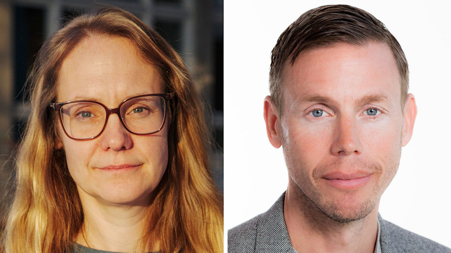 Karin Herlitz, lärare i svenska och engelska på Nacka gymnasium utanför Stockholm, och Anders Boman, enhetschef nationella prov på Skolverket. Foto: Linnéa Tammerås och Skolverket