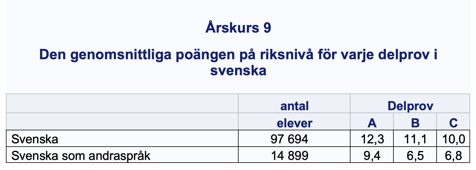 Varje delprov kan ge maximalt 18 poäng. För att få ett godkänt betyg måste eleven ha minst 16 poäng när delprovspoängerna för A+B+C adderas. Förra året lyckades 94,2 procent av eleverna få det i svenska och 73,7 procent i svenska som andraspråk. Så här många poäng fick de då i snitt på respektive delprov. A=muntliga, B=läsa, C=skriva. Källa: Skolverket