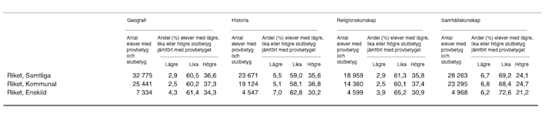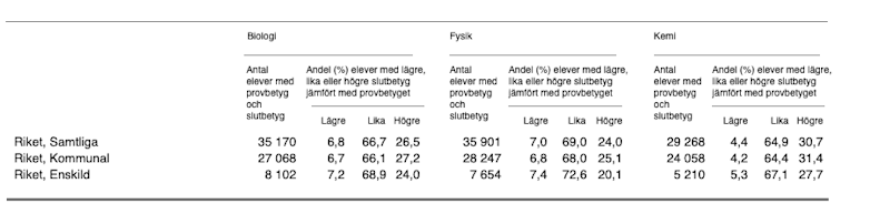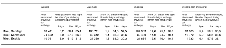 Skolverkets statistik visar också att lärarna i de kommunala skolorna är mer benägna än lärarna i de fristående skolorna att sätta högre slutbetygen jämfört med de nationella proven. I svenska är andelen elever i kommunala skolor med högre slutbetyg jämfört med provbetyget 36,5 procent. I friskolorna är motsvarande andel 31,3 procent. I matematik är mönstret detsamma – slutbetyget är högre än provresultatet för 35,6 procent av eleverna i de kommunala skolorna och 30,2 procent av eleverna i de fristående skolorna.