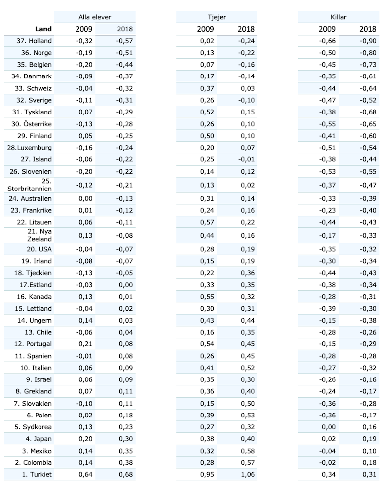 Om man däremot tittar på pojkarnas läslustindex är det hela tio länder som ligger sämre till än Sverige, 2009 var bara fem länder sämre än vi. Så trots att svenska killarnas index också sjunker något har de faktiskt klättrat upp fem placeringar i OECD-ligan då raset är betydligt brantare i flera andra länder (se hela rankningen under artikeln).