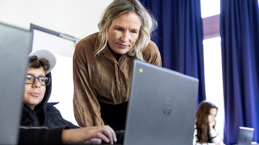 Läraren Anna Stenfeldt kollar hur det går med skrivandet under lektionen i religionskunskap. Foto: André de Loisted