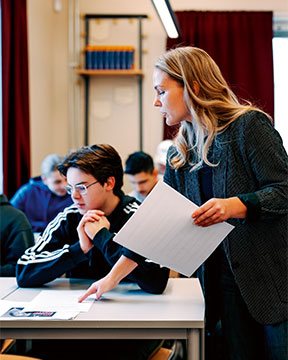 Medan eleverna diskuterar i par, går Sara Johansson runt i klassrummet för att höra hur de resonerar kring de olika frågorna. Här med Adrian Borg.