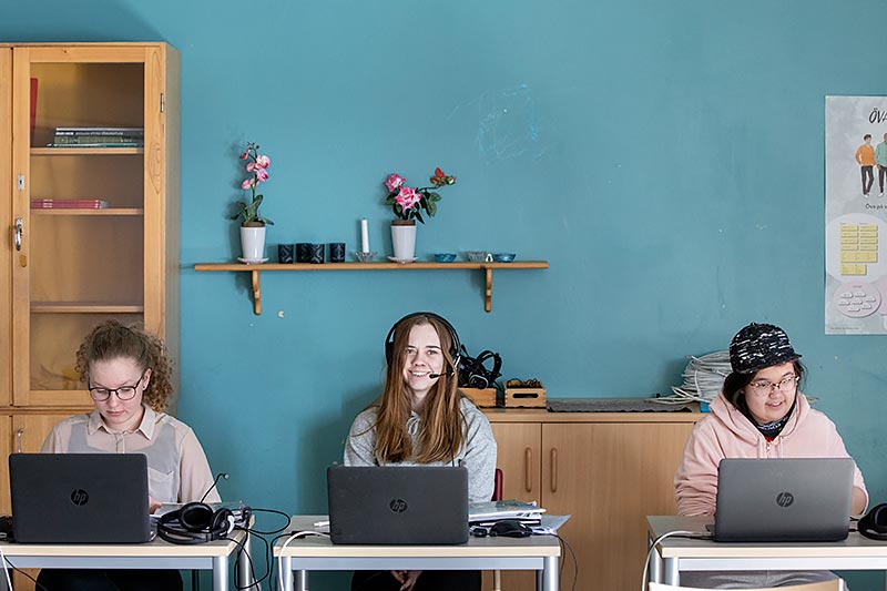 Helena tycker det är smidigast när varje elev jobbar vid en egen skärm så här, men i större grupper är det storskärm som gäller. Då är så kallade ljudpuckar utplacerade i rummet, som gör att hon kan höra allt som sägs. Då delar hon också ofta upp klassen i två grupper. Eleverna kan då använda chattfunktionen för att ställa frågor till henne. Den är över huvud taget mycket bra, tycker hon, inte minst för att det går att kommunicera enskilt via den.