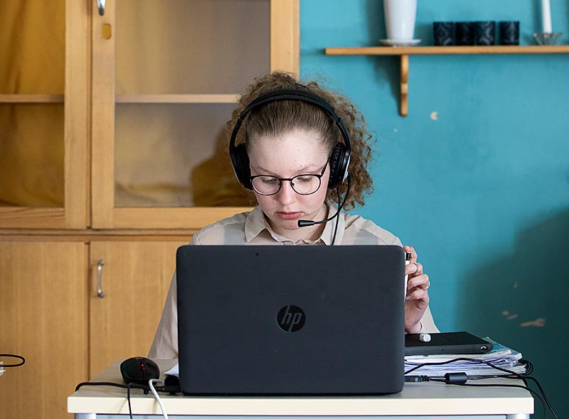 Tjejerna upplever att det är lättare att koncentrera sig när man sitter vid en egen skärm där allt hörs i lurarna och den som för tillfället pratar syns. Det enda jobbiga är att behöva se sig själv på skärmen tycker de.