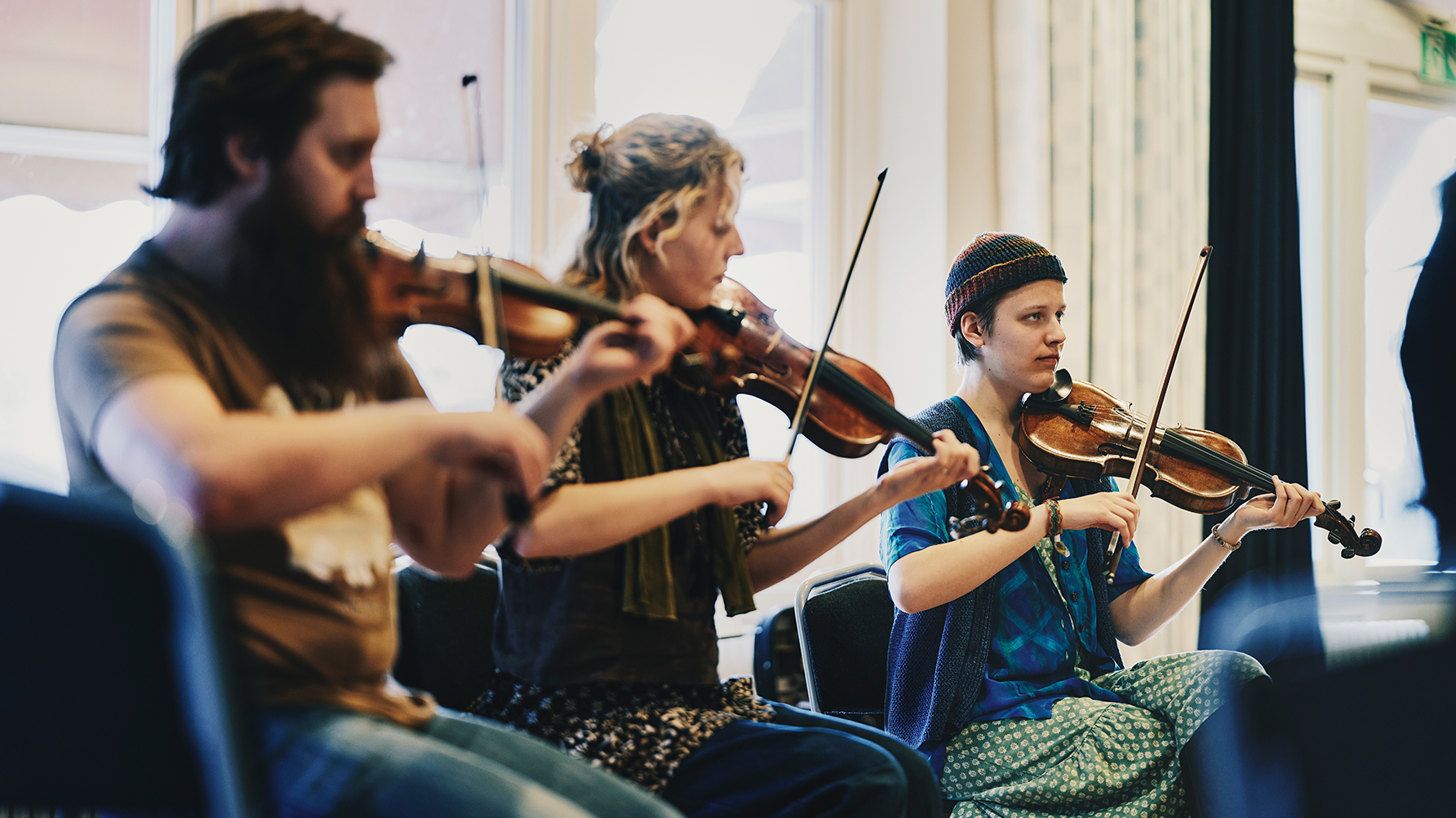 Simon Grahn, Erinn Anchaert och Lina Daun är tre av deltagarna i kursen ”Folkmusik på fiol”. Foto: Oskar Omne.