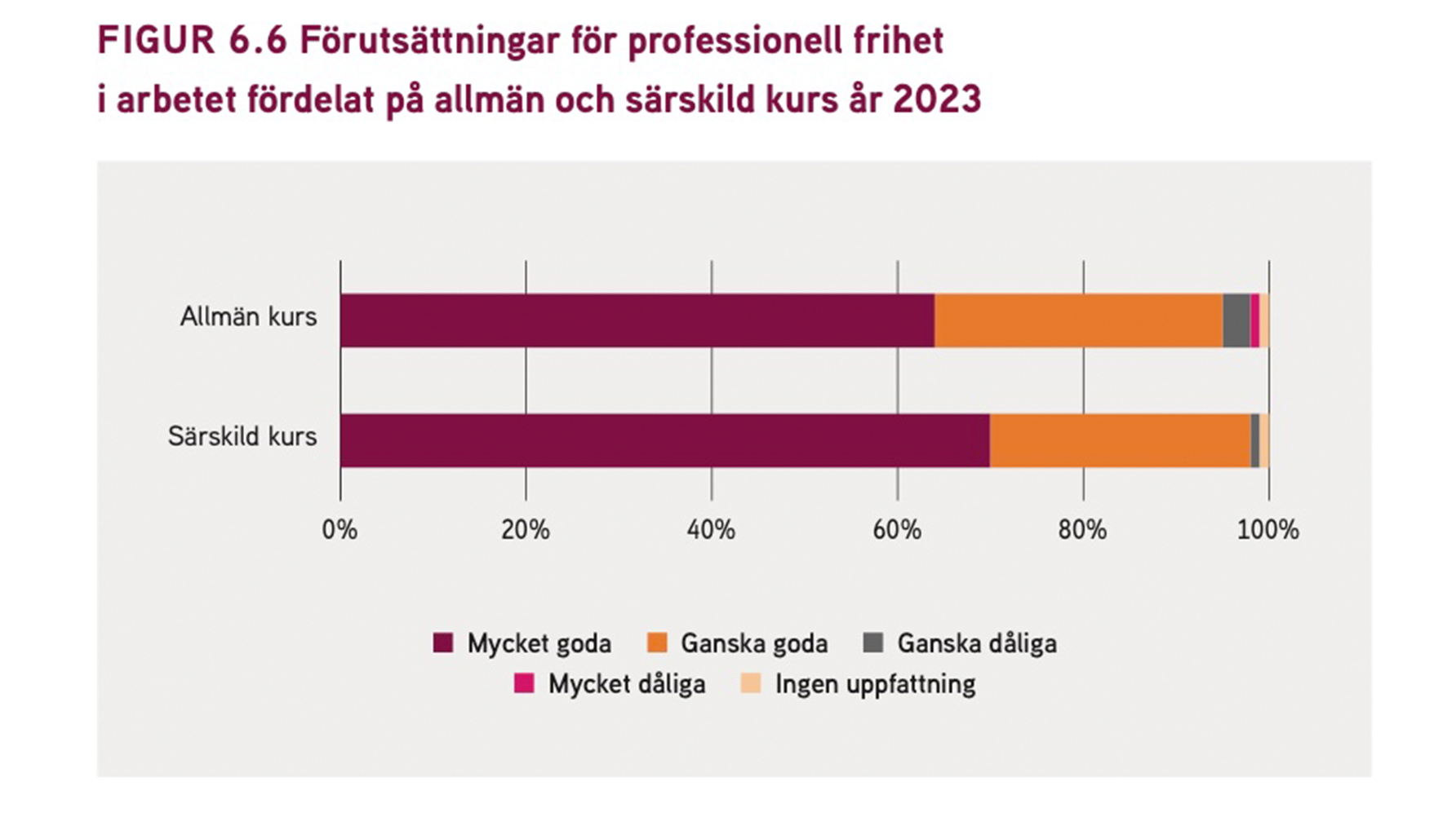 – Nu spekulerar jag lite, men en tolkning kan vara att det handlar om det ”yrkesmässiga kallet”. Att arbeta på allmän kurs går till stor del ut på att ta sig an fall som den vanliga skolan inte har klarat av. Det handlar om något mer än bara lönen. Och inom särskild kurs består mycket av undervisningen av yrkesutbildning inom socialt arbete och fritid samt av estetisk och kulturell bildning, även det ”feminiserade” yrkesdomäner.