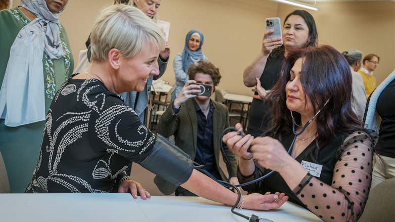 Skolan erbjuder undersköterskeutbildningen på gymnasienivå, som ger deltagarna behörighet att söka en framtida sjuksköterskeutbildning. Här kontrolleras blodtrycket på äldre- och socialförsäkringsminister Anna Tenje. Foto: Sophie Lagerholm.