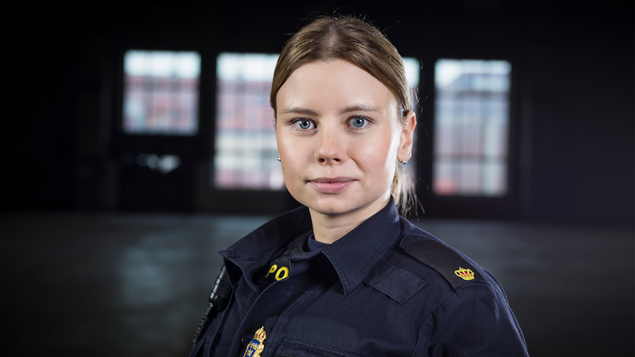 Polisen Sara är redo för nya uppdrag. Rollen som Sara i ”Tunna blå linjen” på SVT görs av Amanda Jansson, som har gått på Fridhems folkhögskola. Foto: Carolina Romare /SVT