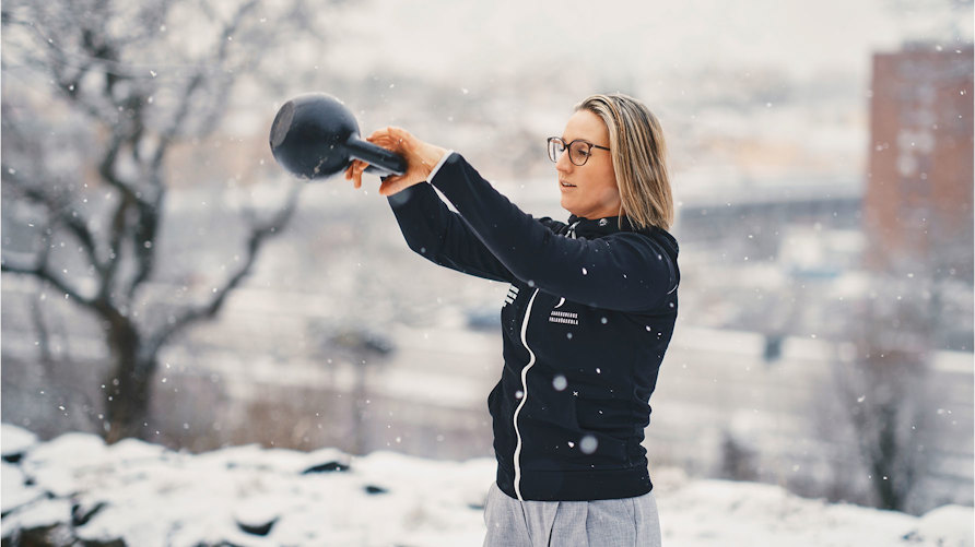 Sanna Magnusson är ny lärare på Jakobsbergs folkhögskola och undervisar på hälsoutvecklarlinjen. Kettlebell hanterar hon med lätthet såväl i skolans gym som ute i snöfallet. Foto: Oskar Omne
