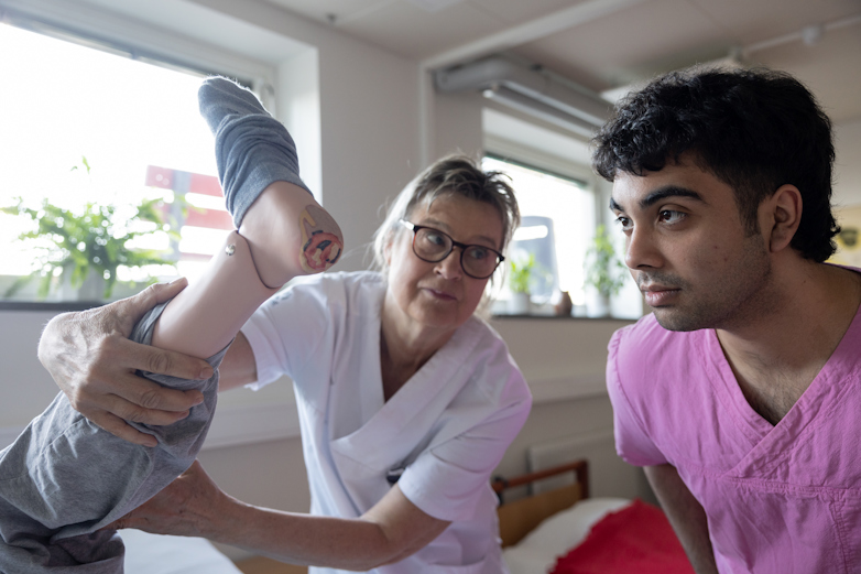 I skolans metodrum är det full aktivitet. Farah Tahir, Jesper Lundin, Henrik Olsson och Komail Sayed betraktar och beskriver såren som dockan Kim har. Därefter får Jesper agera patient medan kompisarna tränar på att vända honom i sängen.