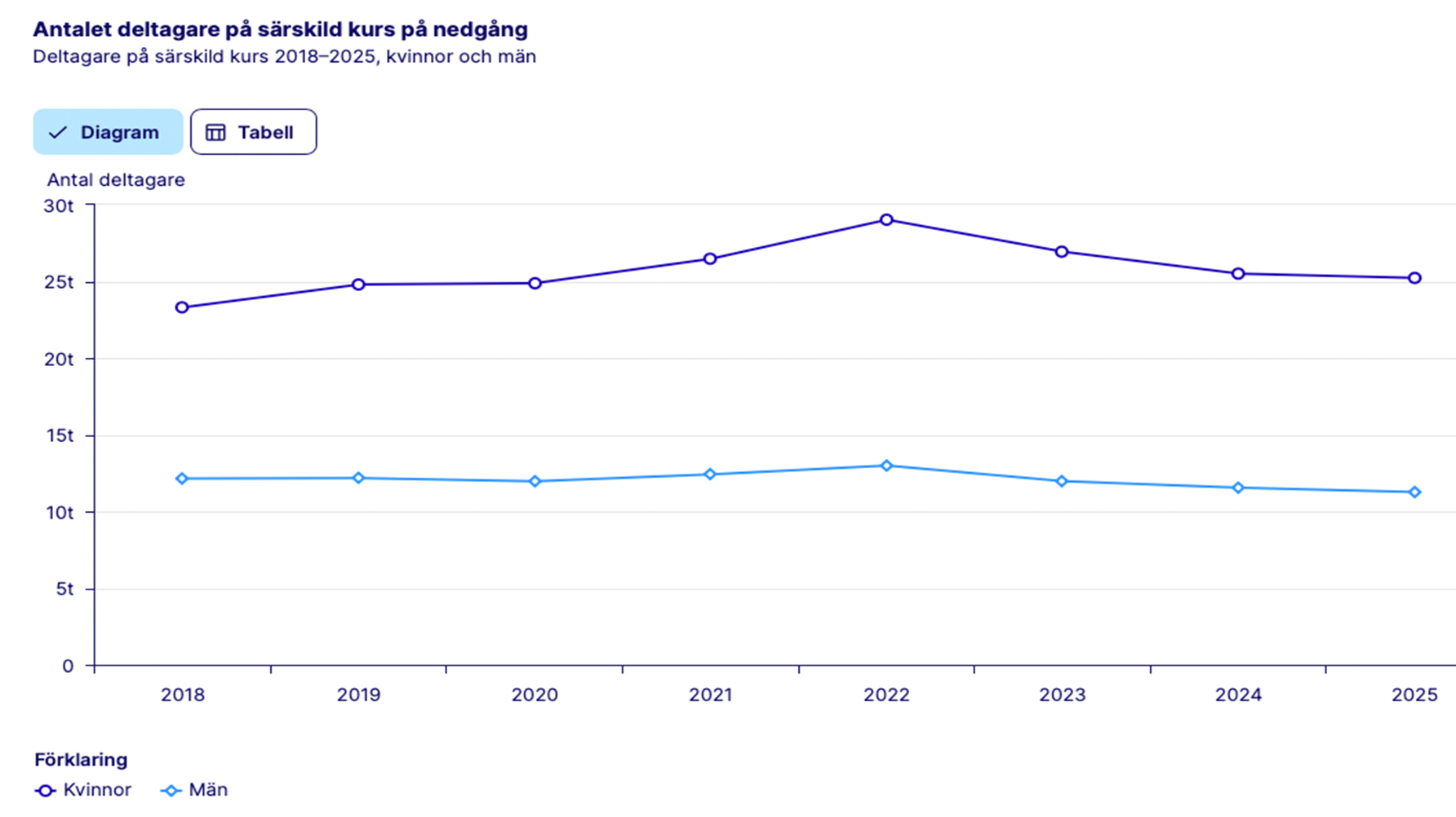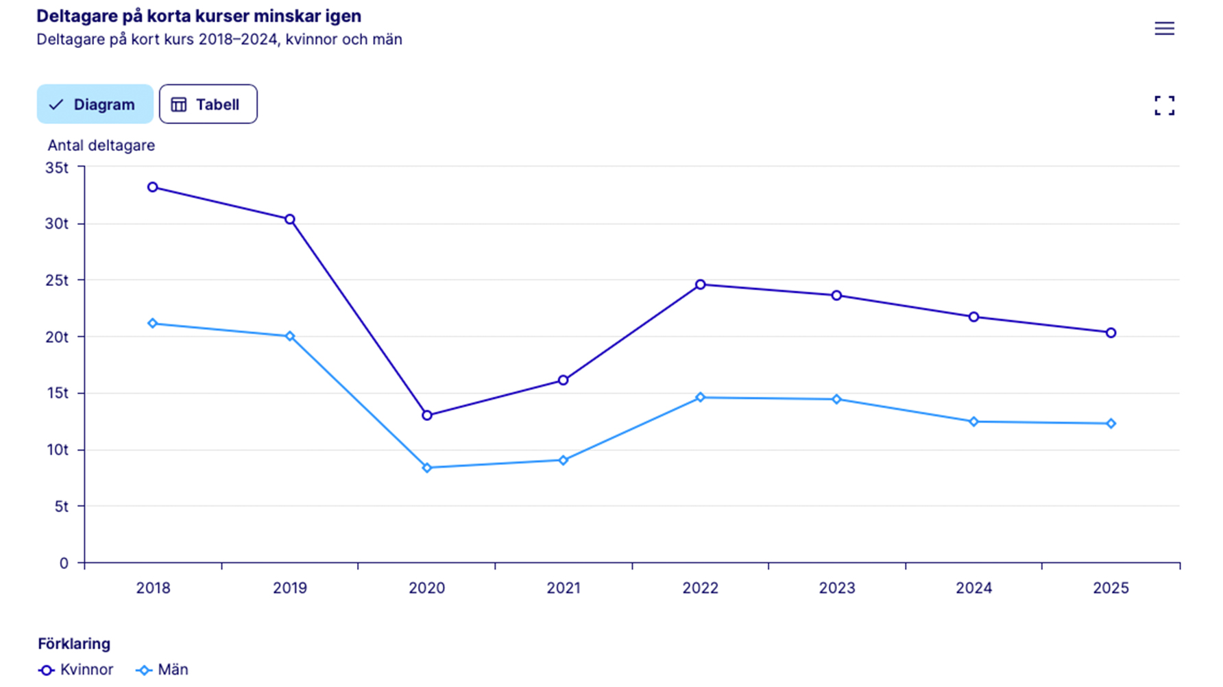 Den senaste mätningen är från 2025. Då samlade allmän kurs 17 809 deltagare. Det kan jämföras med 22 469 deltagare år 2021. Minskningen av deltagare inleddes år 2022 och trenden har fortsatt. Dock har antalet kvinnliga deltagare ökat något mellan år 2024 och 2025. Men minskningen av antalet manliga deltagare har gett en total minskning på allmän kurs. Olle Westberg, generalsekreterare på Rörelsefolkhögskolornas intresseorganisation (RIO), ger en förklaring till tappet.