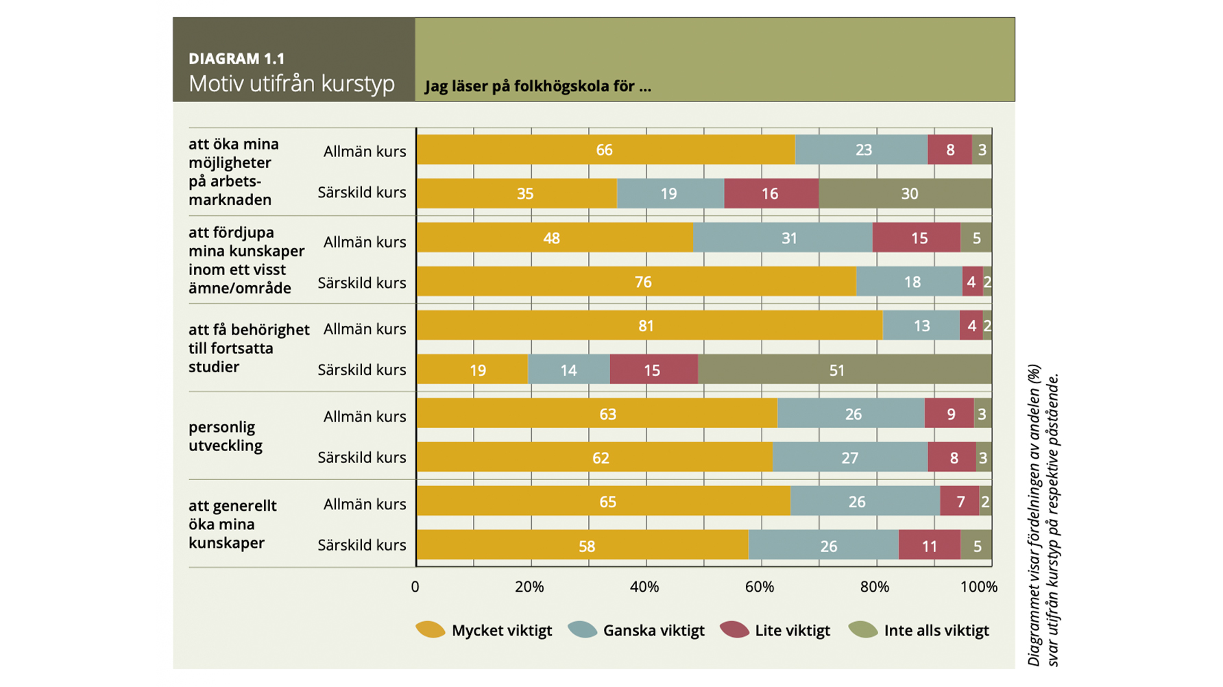 Relativt många läser på folkhögskola för att öka sina möjligheter på arbetsmarknaden. I åldrarna 25–44 år ligger siffran på 60 procent, beräknat på både allmän och särskild kurs.