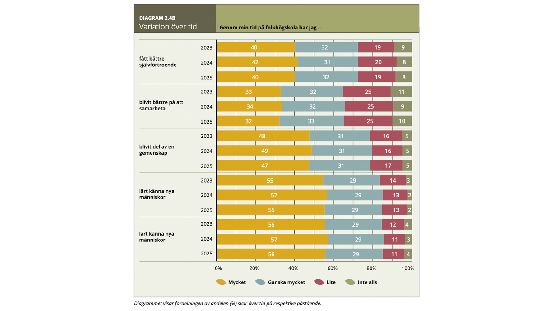 I årets undersökning deltog 118 folkhögskolor, vilket motsvarar 45 procent av landets deltagare på allmän och särskild kurs. Rapporten rymmer en rad positiva resultat.