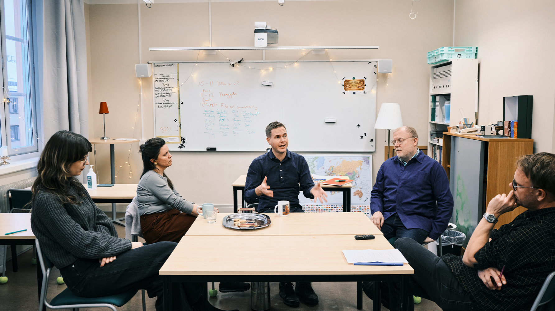 I varje klass går ungefär 19 deltagare, delvis beroende på att det inte får plats fler i klassrummen. Alla arbetslag har ett möte i veckan och Gustav Fridolins panna rynkas när han säger att det inte känns bra om de inte får till det där mötet. De andra håller med. När de inte får prata igenom saker blir det lite gungflykänsla efter ett tag. Men de har mycket kontakt digitalt, både de som har klasser ihop, men också hela gruppen. De trådarna är lååånga.